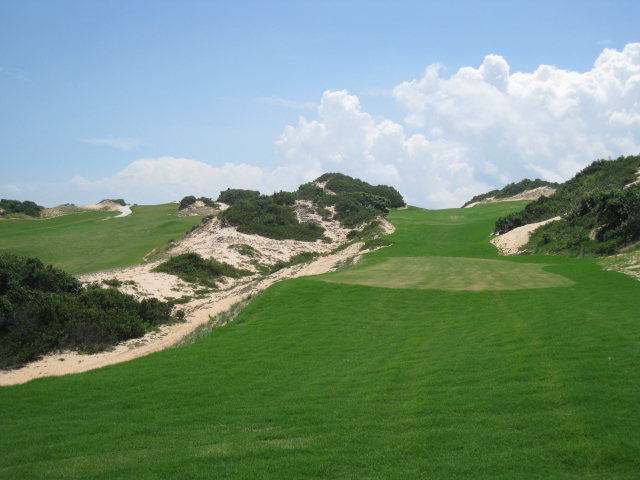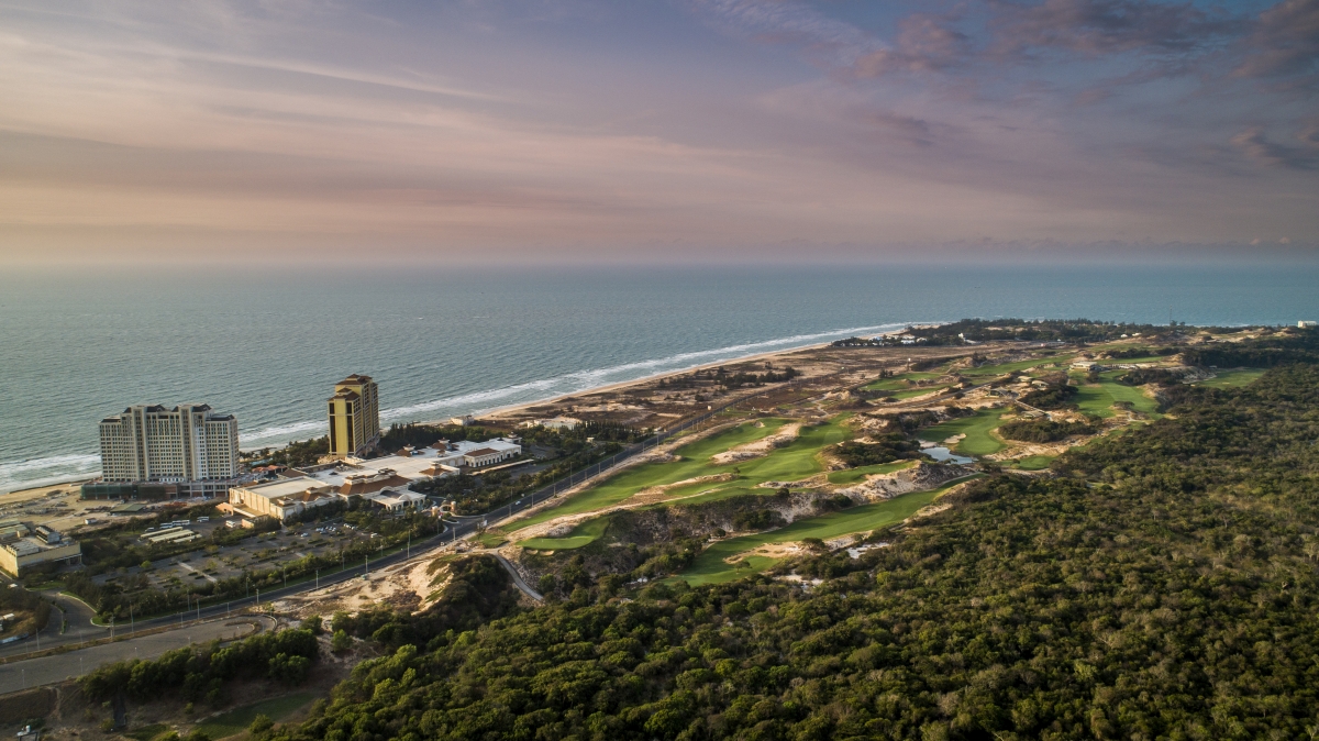 The Bluffs Ho Tram Strip, masterfully crafted by golf legend Greg Norman, offers an unforgettable golfing adventure just a scenic two-hour drive from the vibrant energy of Ho Chi Minh City. Nestled on the picturesque southern Vietnamese coastline in Ba Ria-Vung Tau Province, this unique links-style par-71 course promises a journey through rugged beauty. Imagine teeing off on a coastal plateau with dramatic elevation changes, where towering seaside dunes frame each hole and the native, wind-swept vegetation adds to the breathtaking natural artistry. The sandy loam soil ensures impeccable drainage and turf conditions, providing a superb playing surface that is as visually stunning as it is challenging, promising an experience that will captivate your senses.