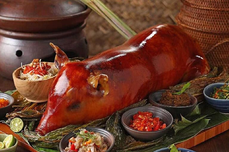 The undisputed king of Balinese cuisine. It is a whole pig stuffed with turmeric, coriander, lemongrass, and garlic, spit-roasted over a fire. The crackling skin is legendary. Try Ibu Oka in Ubud or local warungs in Seminyak.
