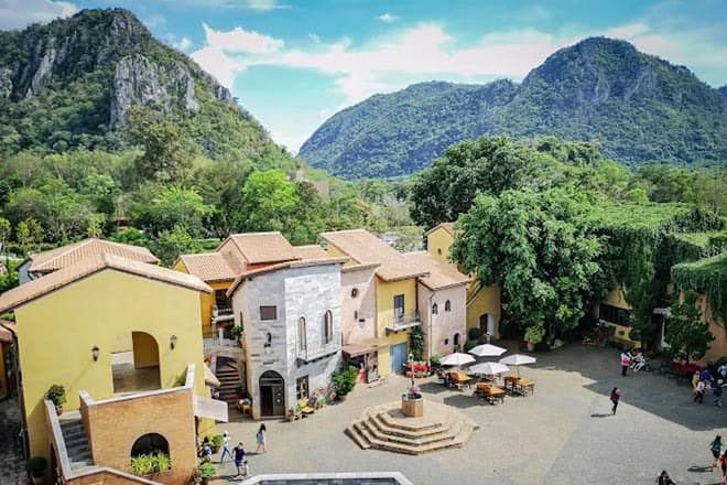 Visit Primo Piazza or Palio, charming Italian-themed villages perfect for strolling, coffee, and taking photos.