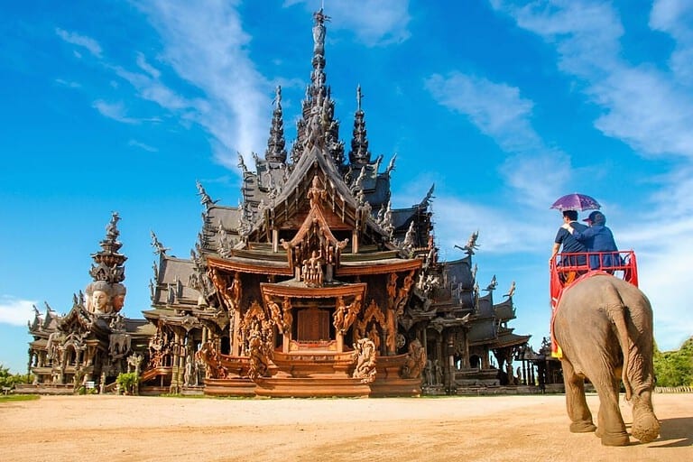 Visit the Sanctuary of Truth, an awe-inspiring giant wooden structure carved entirely by hand without a single metal nail. It is a architectural wonder right on the ocean.